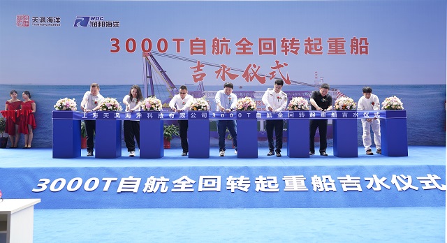 6月6日13點18分,由子公司潤邦海洋承建的上海天沨“3000噸自航式全回轉起重船”吉水儀式在潤邦海洋船台隆重舉行。上海天沨總經理周鋒先生,中國船級社張洪村先生,潤邦股份董事長龍勇先生、潤邦海洋執行董事施曉越先生、總經理邵夕吾先生等領導出席了吉水儀式,共同見證這一重要時刻。